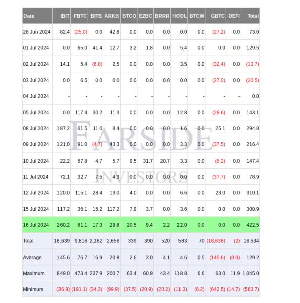 Farside Investors’ın da aralarında bulunduğu kaynaklardan alınan verilere göre, 16 Temmuz’da 422 milyon dolarlık net giriş gerçekleşti.