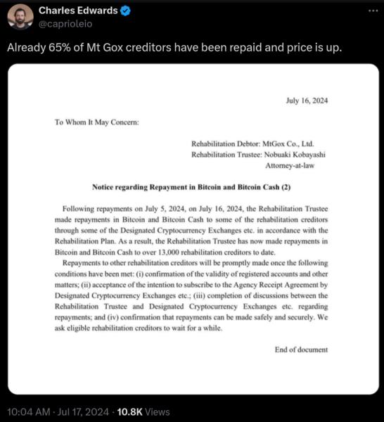 Bitcoin ve dijital varlık fonu Capriole Investments’ın kurucusu Charles Edwards, borsadan gelen yazışmalara atıfta bulunarak, Mt. Gox fonlarının yüzde 65’inin halihazırda serbest bırakılmış olması ve fiyatın hala tırmanıyor olması nedeniyle müşterilerin hemen satışa yönelmediğini öne sürdü.